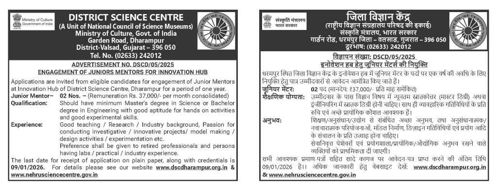विज्ञापन संख्या DSCD/05/2025 विज्ञापन संख्या DSCD/05/2025 जिला विज्ञान केंद्र, धरमपुर के इनोवेशन हब में जूनियर मेंटर की नियुक्ति के विज्ञापन विवरण के लिए यहां क्लिक करें। विज्ञापन संख्या DSCD/03/2025 यहां क्लिक करें – प्रशिक्षु शिक्षा 2025 के लिए विज्ञापन का विवरणयहां क्लिक करें – डीएससीडी – विज्ञान संचारक -2025 के लिए आवेदन पत्र यहां क्लिक करें – डीएससीडी – आवेदन पत्र – प्रशिक्षु शिल्प -2025 विज्ञापन संख्या DSCD/02/2025 आवेदन पत्र डाउनलोड करने के लिए यहां क्लिक करें।विज्ञापन विवरण डाउनलोड करने के लिए यहां क्लिक करें। Lorem ipsum dolor sit amet, consectetur adipiscing elit. Ut elit tellus, luctus nec ullamcorper mattis, pulvinar dapibus leo. Lorem ipsum dolor sit amet, consectetur adipiscing elit. Ut elit tellus, luctus nec ullamcorper mattis, pulvinar dapibus leo.