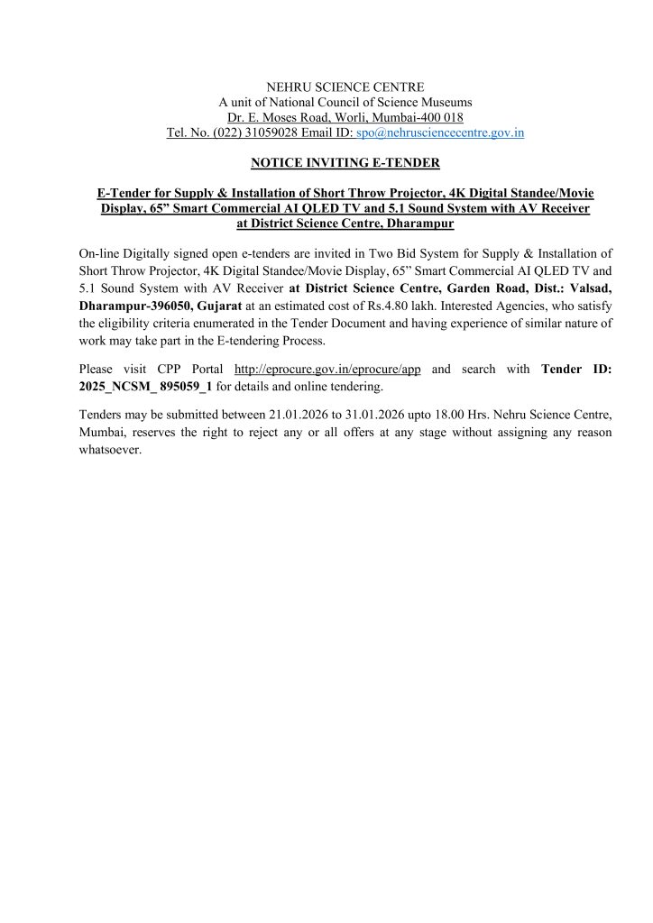निविदा सूचना जिला विज्ञान केंद्र, धरमपुर हेतु इलेक्ट्रॉनिक उपकरणों की आपूर्ति और स्थापना से संबंधित संलग्न निविदा सूचना।